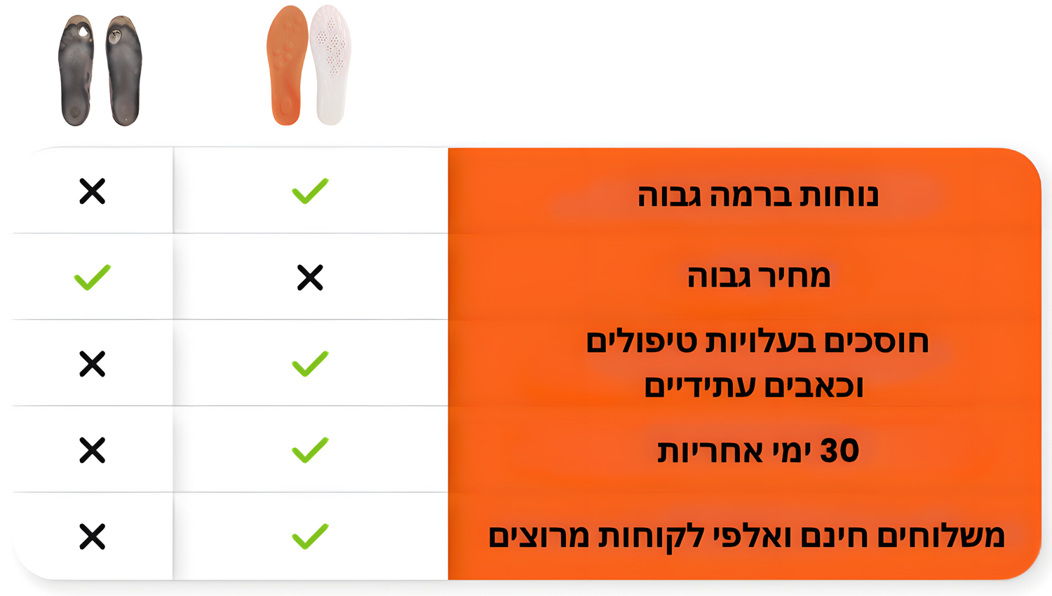 ממש לא. המדרסים שלנו מיוצרים כך שיספקו נוחות ותמיכה בלי ללחוץ על האצבעות. הם מעוצבים בהתאמה למבנה האנטומי של כף הרגל שלך, כדי להבטיח לך תחושת רכות וקלילות לאורך כל היום.