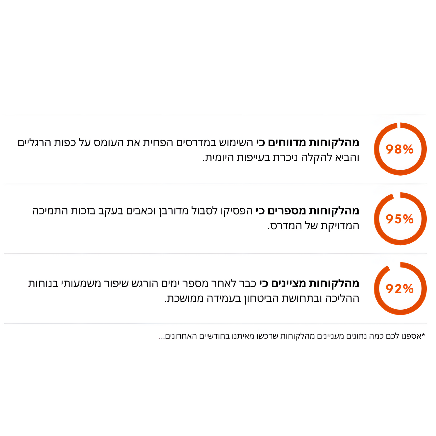 כבר חודשים שאני סובלת מכאבים בעקב, במיוחד אחרי יום עבודה ארוך. מאז שהתחלתי להשתמש במדרסים יש שיפור ענק. ההבדל מורגש כבר מהשבוע הראשון. פשוט הקלה אמיתית!